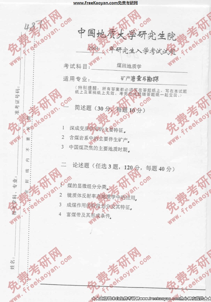 专业课考研经验 本站小编 FreeKaoyan 2018-01-23中国地质大学(武汉)2004年考研真题-矿产勘查与评价