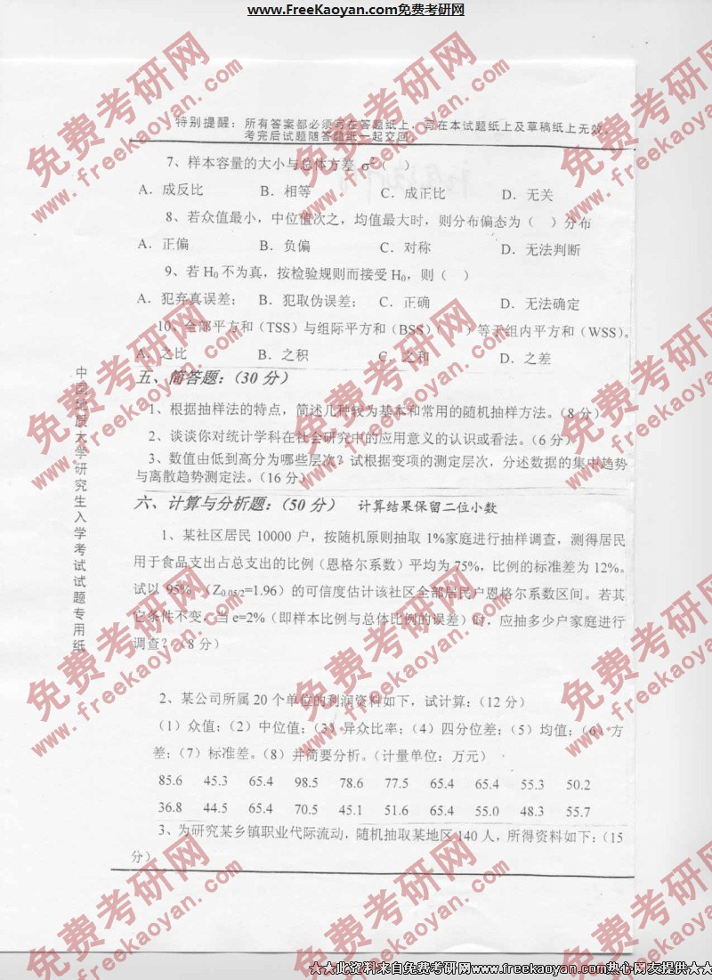 相关话题/考研真题 中国地质大学 统计学 社会