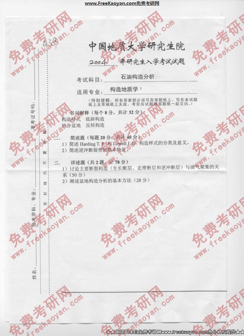 中国地质大学(武汉)2004年考研真题-石油构造分析