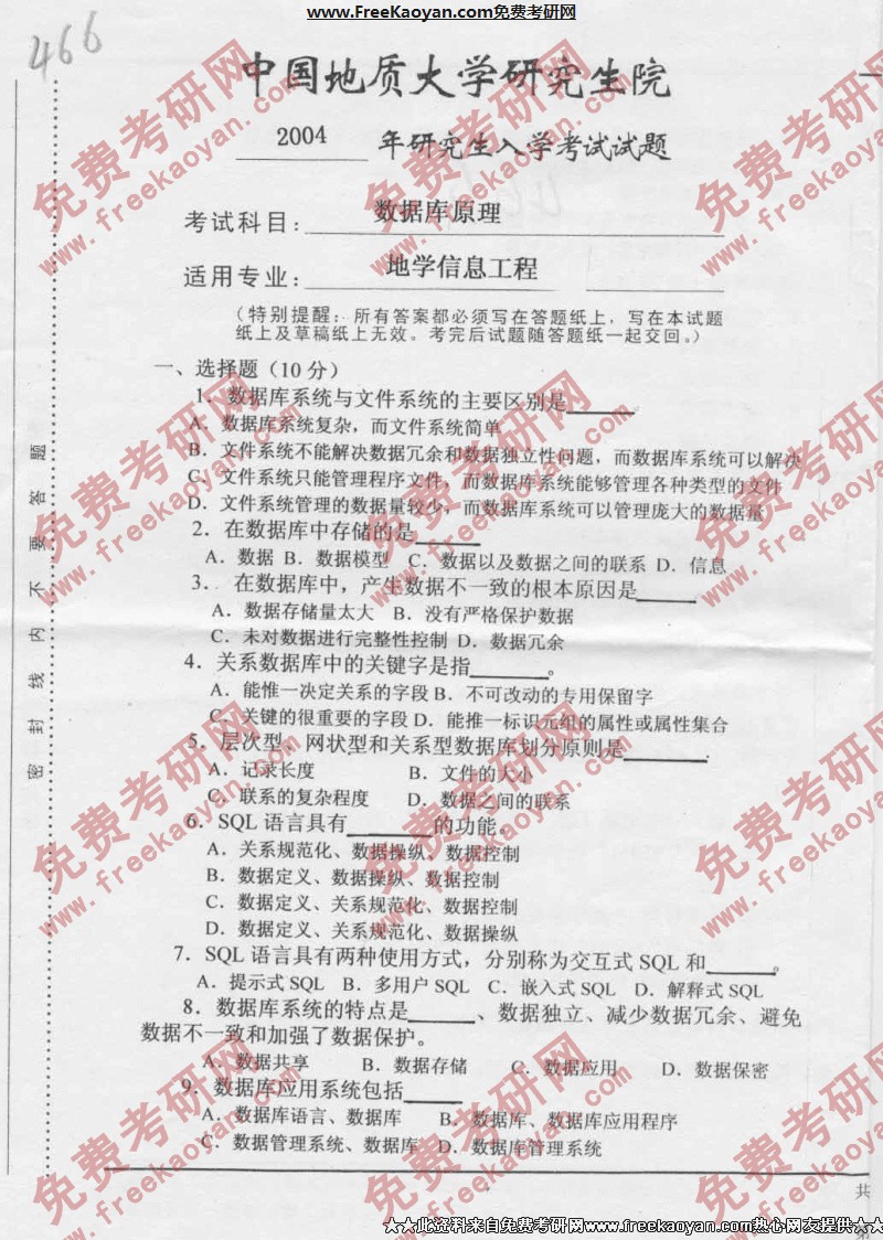 相关话题/考研真题 数据库 中国地质大学 原理