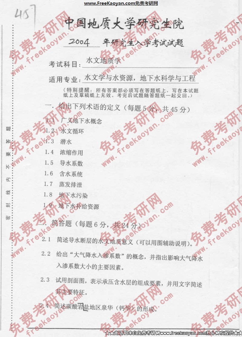 中国地质大学(武汉)2004年考研真题-水文地质学