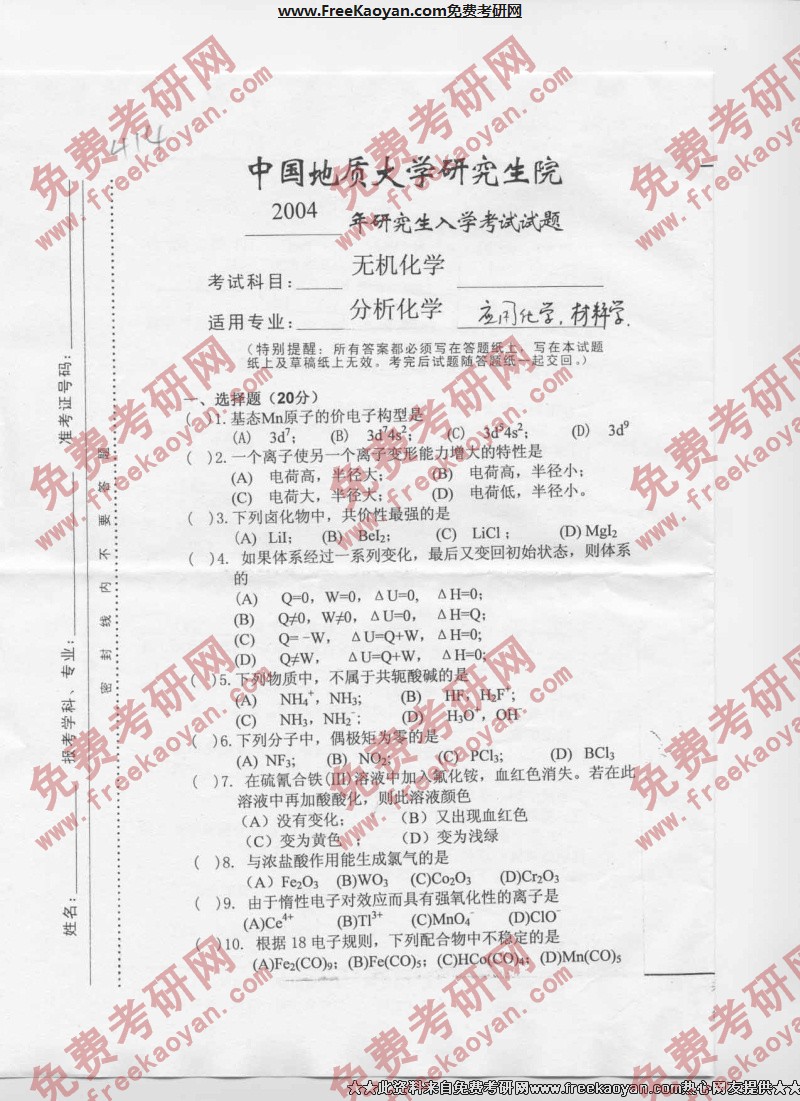 专业课考研经验 本站小编 FreeKaoyan 2018-01-23中国地质大学(武汉)2004年考研真题-土力学