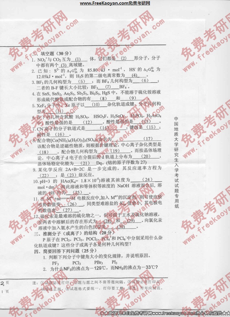 中国地质大学(武汉)2004年考研真题-无机化学(2)