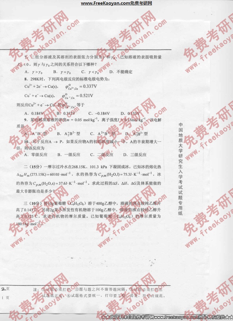 相关话题/中国地质大学 考研真题 物理化学