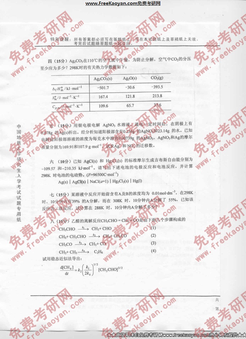 中国地质大学(武汉)2004年考研真题-物理化学(3)