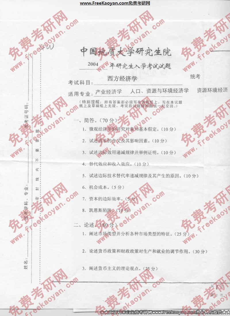 专业课考研经验 本站小编 FreeKaoyan 2018-01-23中国地质大学(武汉)2004年考研真题-土地经济学