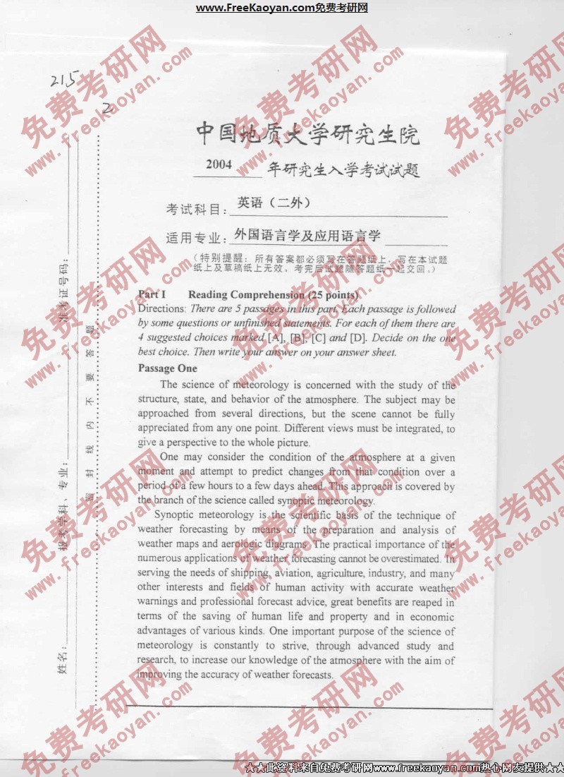 中国地质大学(武汉)2004年考研真题-英语(二外)