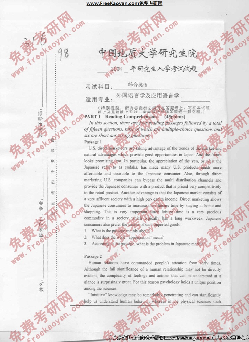 中国地质大学(武汉)2004年考研真题-英语综合考试