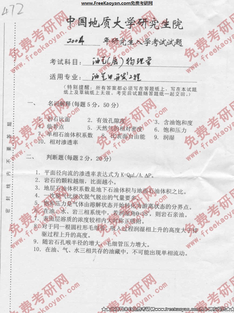 中国地质大学(武汉)2004年考研真题-油气(层)物理学