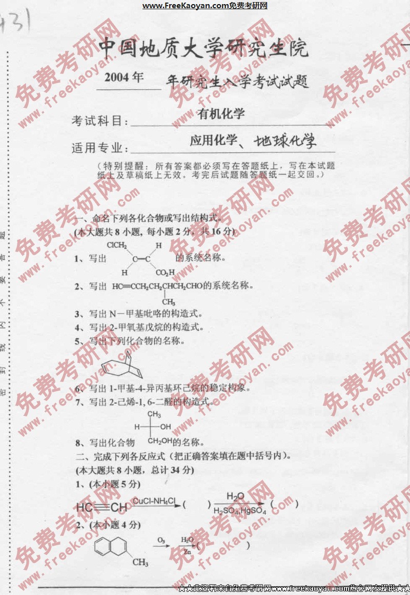 专业课考研经验 本站小编 FreeKaoyan 2018-01-23中国地质大学(武汉)2004年考研真题-无机化学