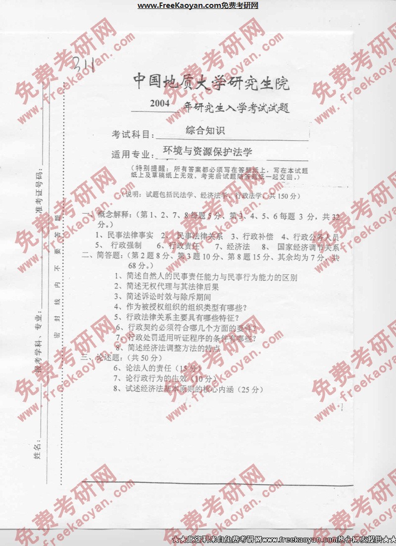 专业课考研经验 本站小编 FreeKaoyan 2018-01-23中国地质大学(武汉)2004年考研真题-资源环境法学