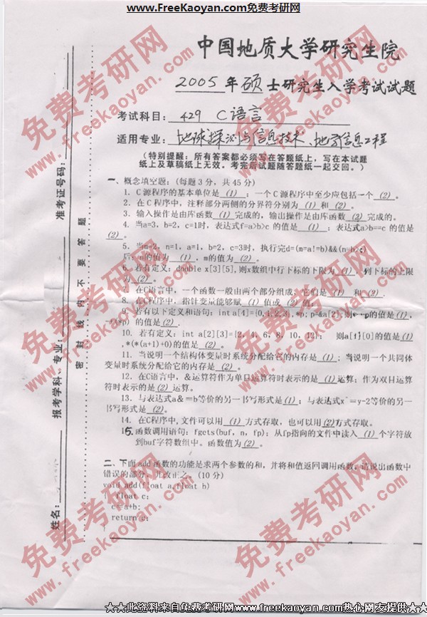 中国地质大学(武汉)2005年考研真题-C语言(资源)