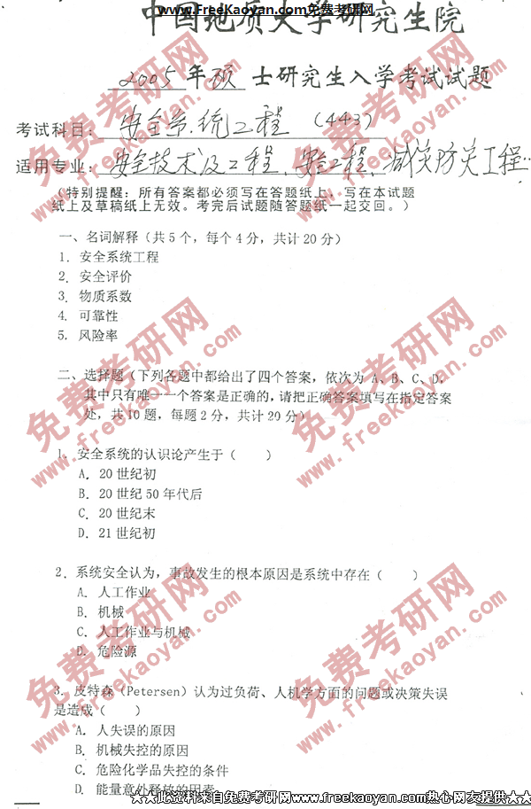 中国地质大学(武汉)2005年考研真题-安全系统工程