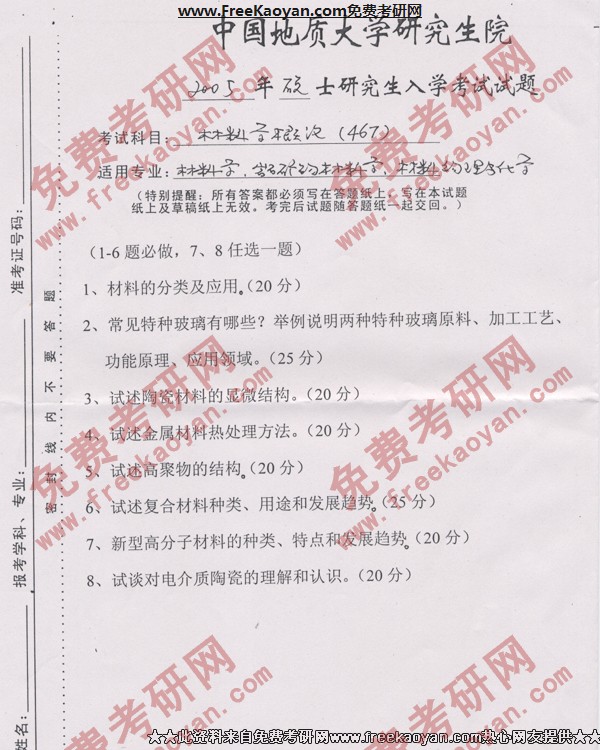 中国地质大学(武汉)2005年考研真题-材料学概论