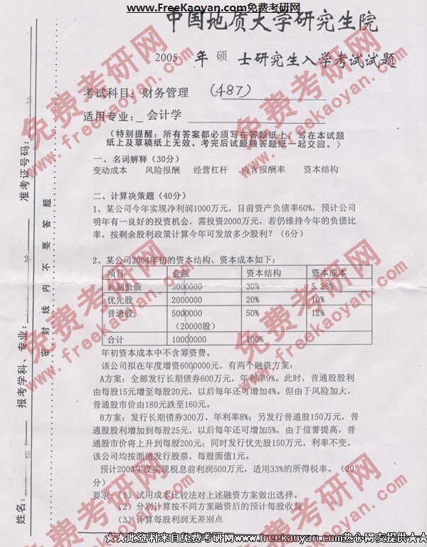 专业课考研经验 本站小编 FreeKaoyan 2018-01-23中国地质大学(武汉)2005年考研真题-安全系统工程