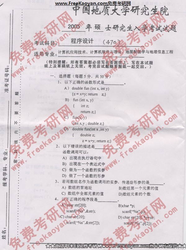 专业课考研经验 本站小编 FreeKaoyan 2018-01-23中国地质大学(武汉)2005年考研真题-C语言程序设计