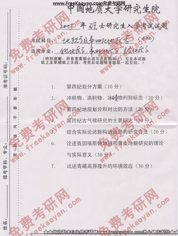 专业课考研经验 本站小编 FreeKaoyan 2018-01-23中国地质大学(武汉)2005年考研真题-沉积环境与沉积相