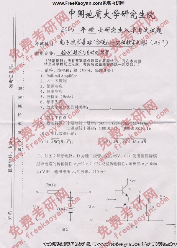 中国地质大学(武汉)2005年考研真题-电子技术基础(含模拟电路和数字电路)