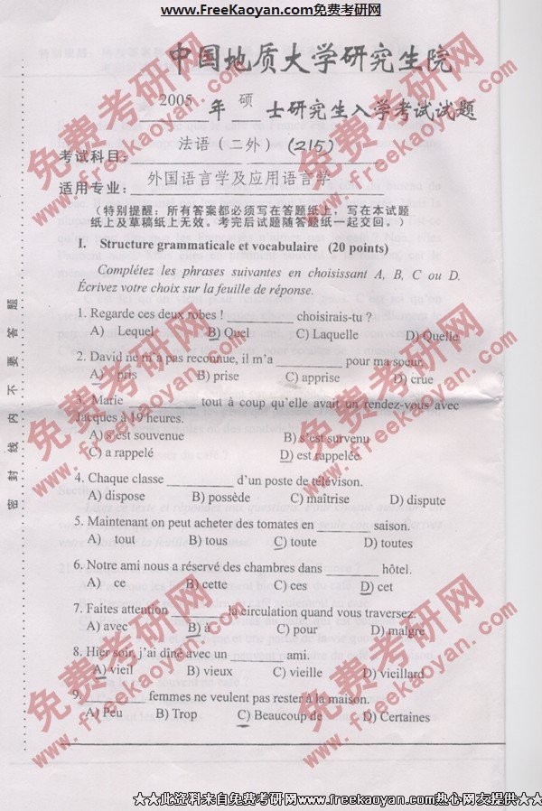 专业课考研经验 本站小编 FreeKaoyan 2018-01-23中国地质大学(武汉)2005年考研真题-德语