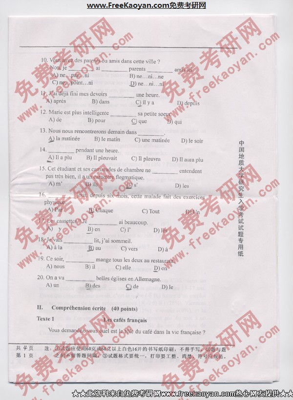 中国地质大学(武汉)2005年考研真题-法语(2)