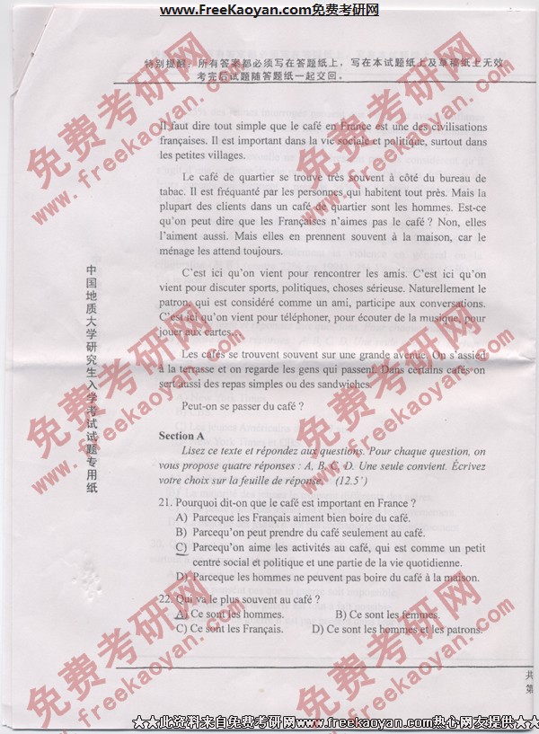 中国地质大学(武汉)2005年考研真题-法语(3)