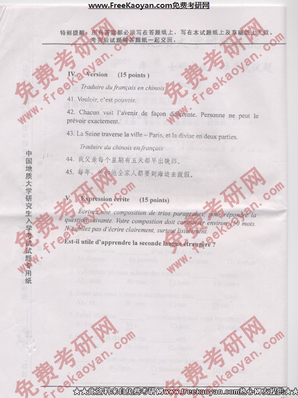 中国地质大学(武汉)2005年考研真题-法语(7)