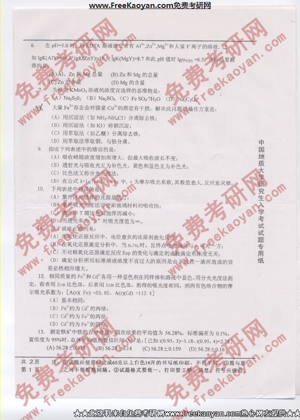 专业课考研经验 本站小编 FreeKaoyan 2018-01-23中国地质大学(武汉)2005年考研真题-地球化学