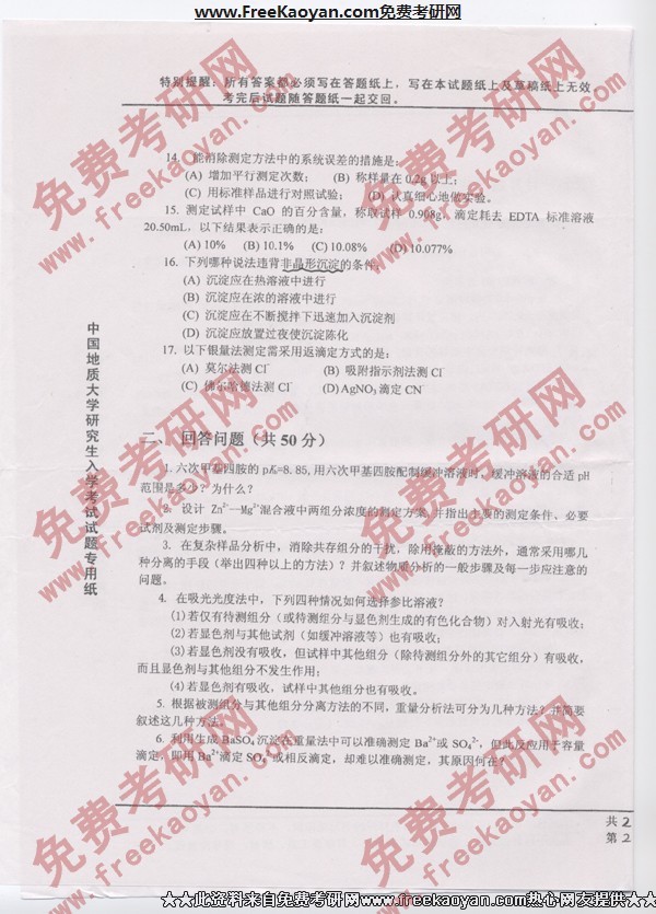 相关话题/中国地质大学 考研真题 分析化学