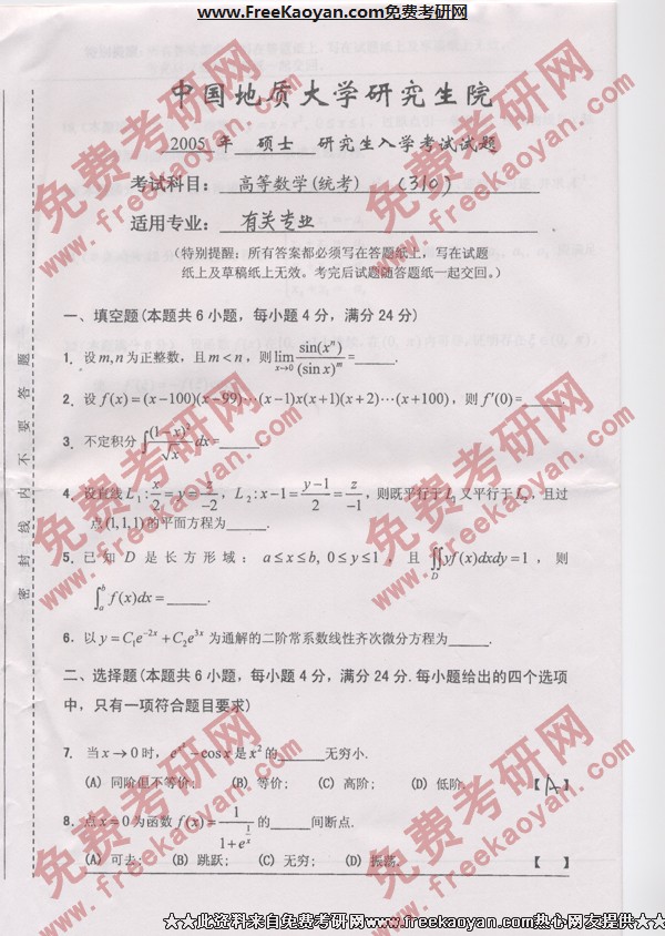 中国地质大学(武汉)2005年考研真题-高等数学