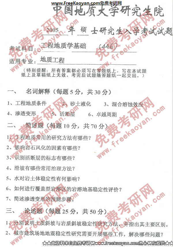 专业课考研经验 本站小编 FreeKaoyan 2018-01-23中国地质大学(武汉)2005年考研真题-工程地质学