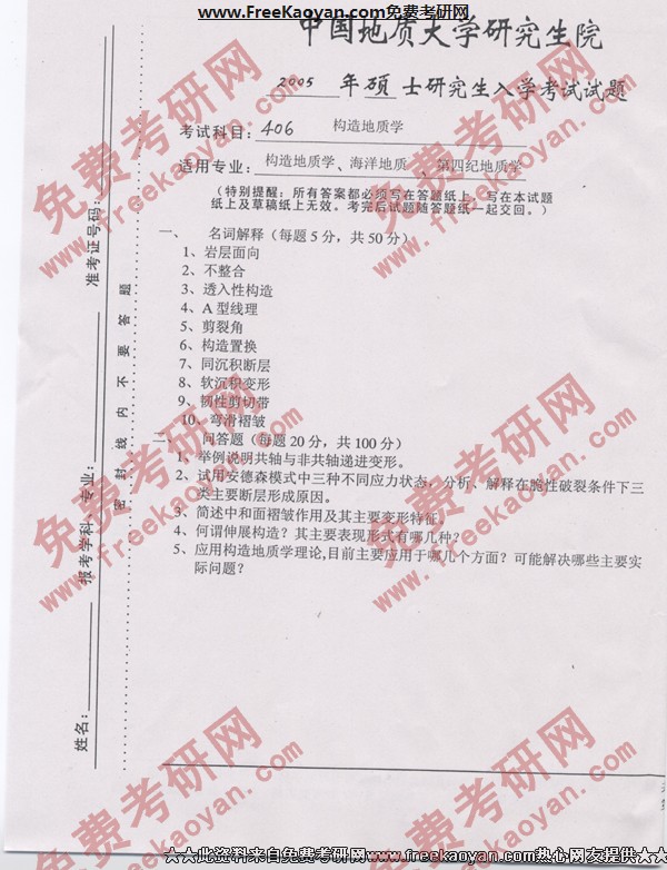 中国地质大学(武汉)2005年考研真题-构造地质学