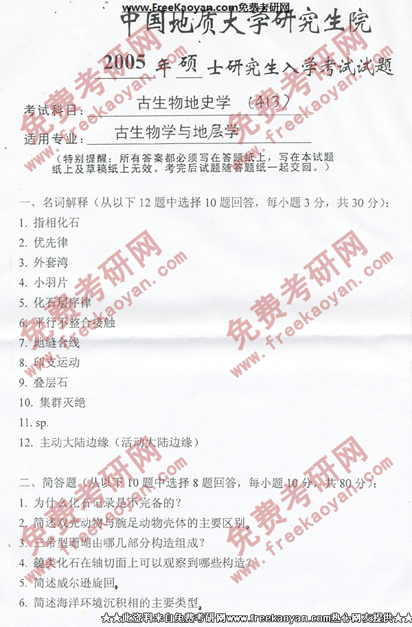 中国地质大学(武汉)2005年考研真题-古生物地史学