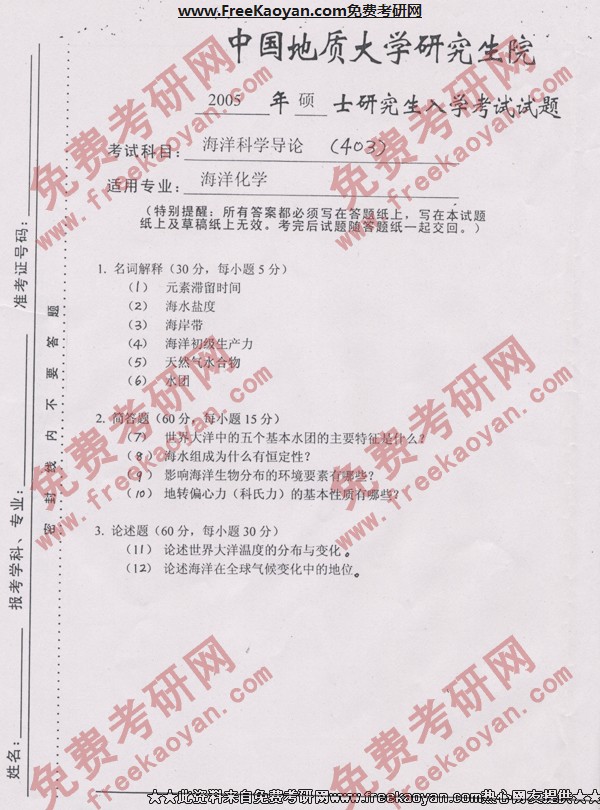 专业课考研经验 本站小编 FreeKaoyan 2018-01-23中国地质大学(武汉)2005年考研真题-海洋地质学