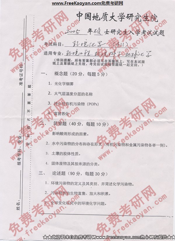 专业课考研经验 本站小编 FreeKaoyan 2018-01-23中国地质大学(武汉)2005年考研真题-环境地质学