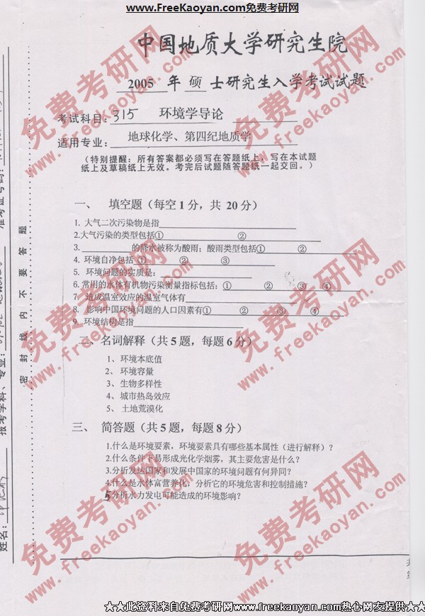 专业课考研经验 本站小编 FreeKaoyan 2018-01-23中国地质大学(武汉)2005年考研真题-环境地质学