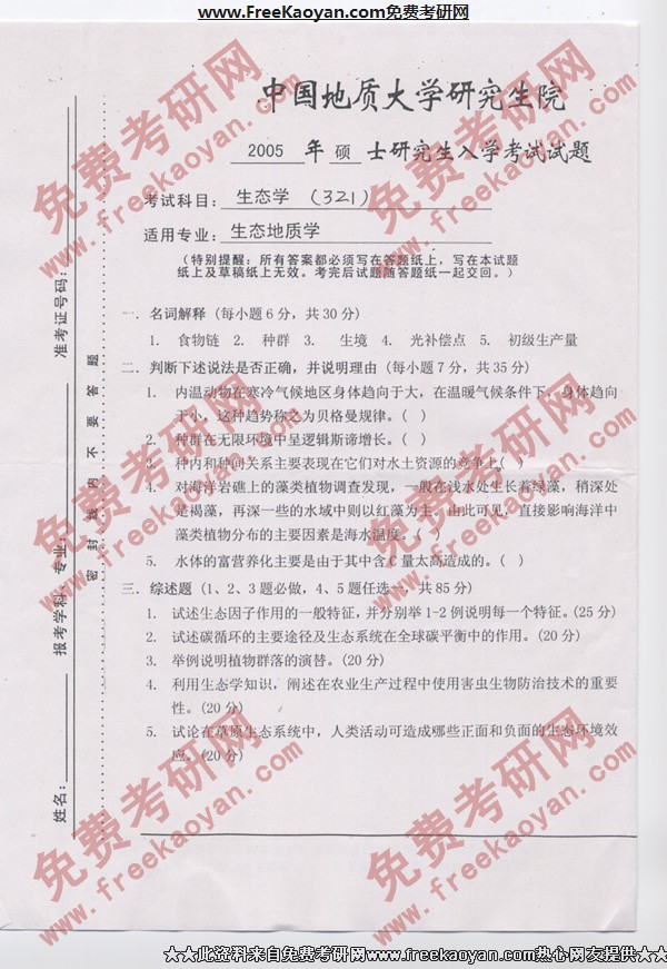 中国地质大学(武汉)2005年考研真题-生态学
