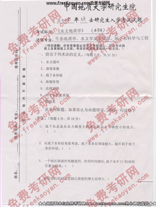 中国地质大学(武汉)2005年考研真题-水文地质学