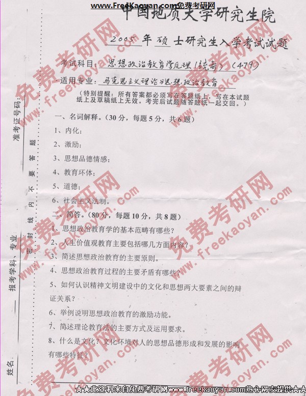 中国地质大学(武汉)2005年考研真题-思想政治教育学原理