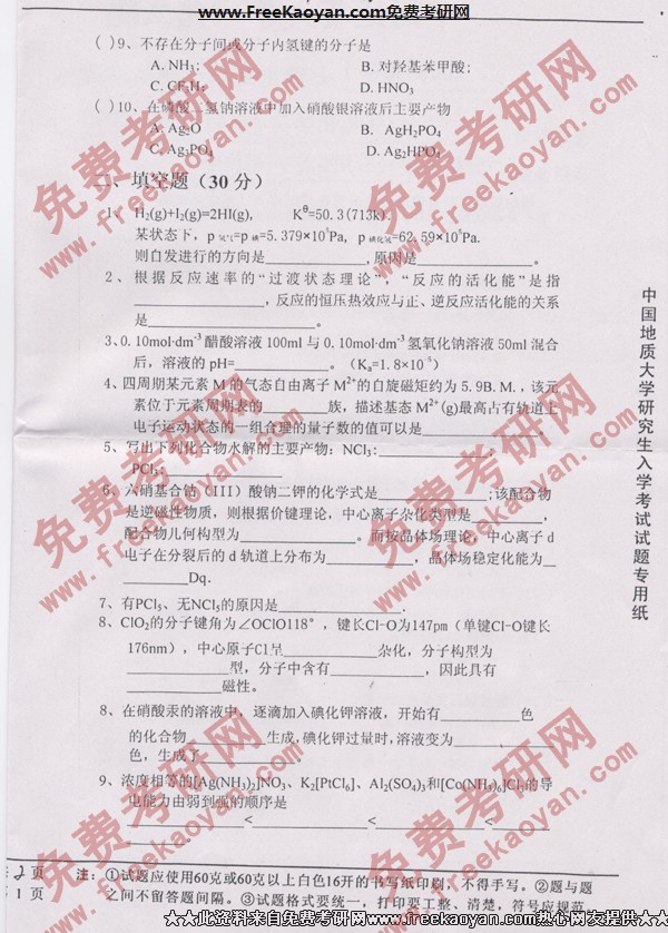 相关话题/中国地质大学 考研真题 无机化学
