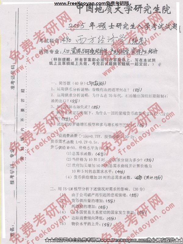 专业课考研经验 本站小编 FreeKaoyan 2018-01-23中国地质大学(武汉)2005年考研真题-土地经济学