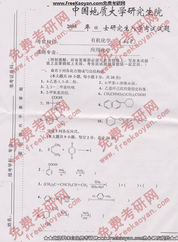 专业课考研经验 本站小编 FreeKaoyan 2018-01-23中国地质大学(武汉)2005年考研真题-无机化学