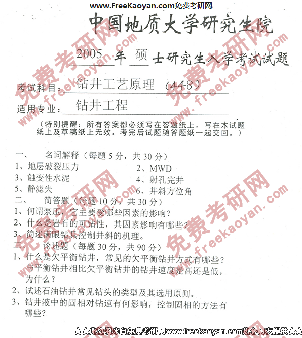 中国地质大学(武汉)2005年考研真题-钻井工艺原理