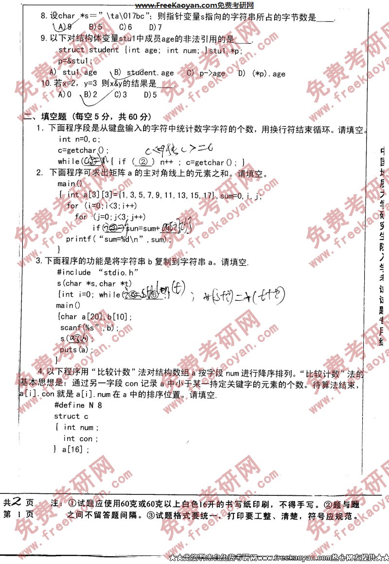 中国地质大学(武汉)2006年考研真题-C语言(2)