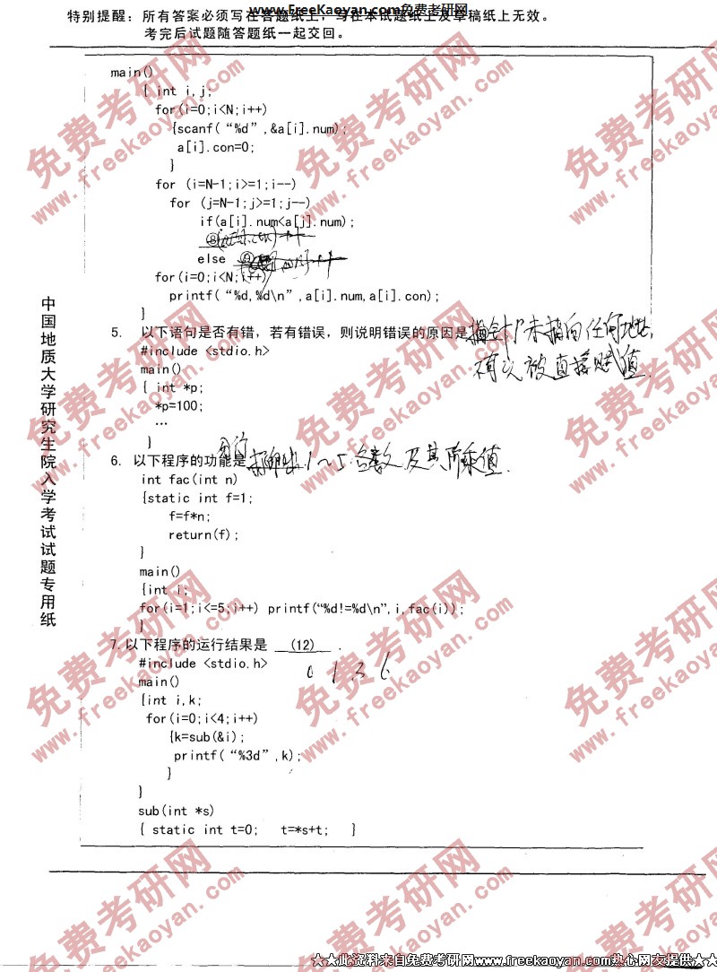 中国地质大学(武汉)2006年考研真题-C语言(3)
