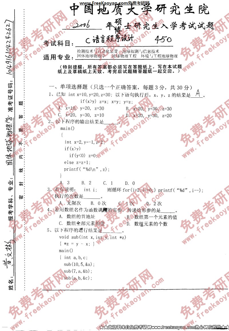 中国地质大学(武汉)2006年考研真题-C语言程序设计