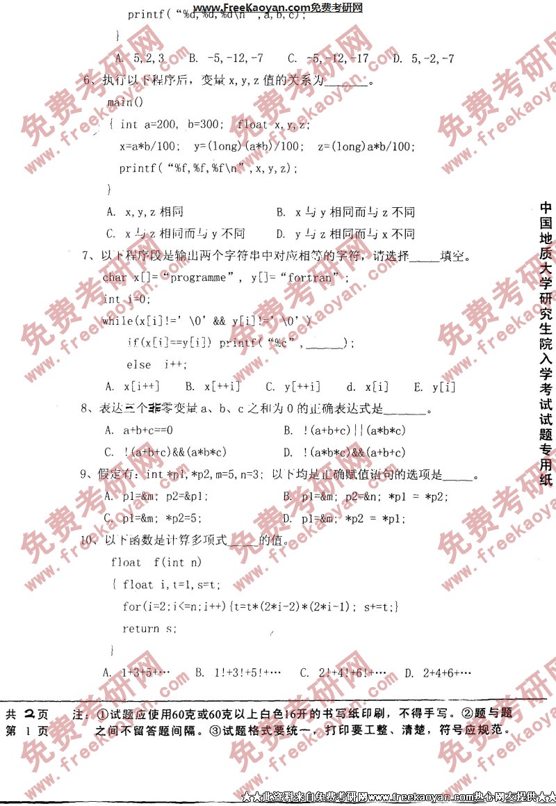 中国地质大学(武汉)2006年考研真题-C语言程序设计(2)