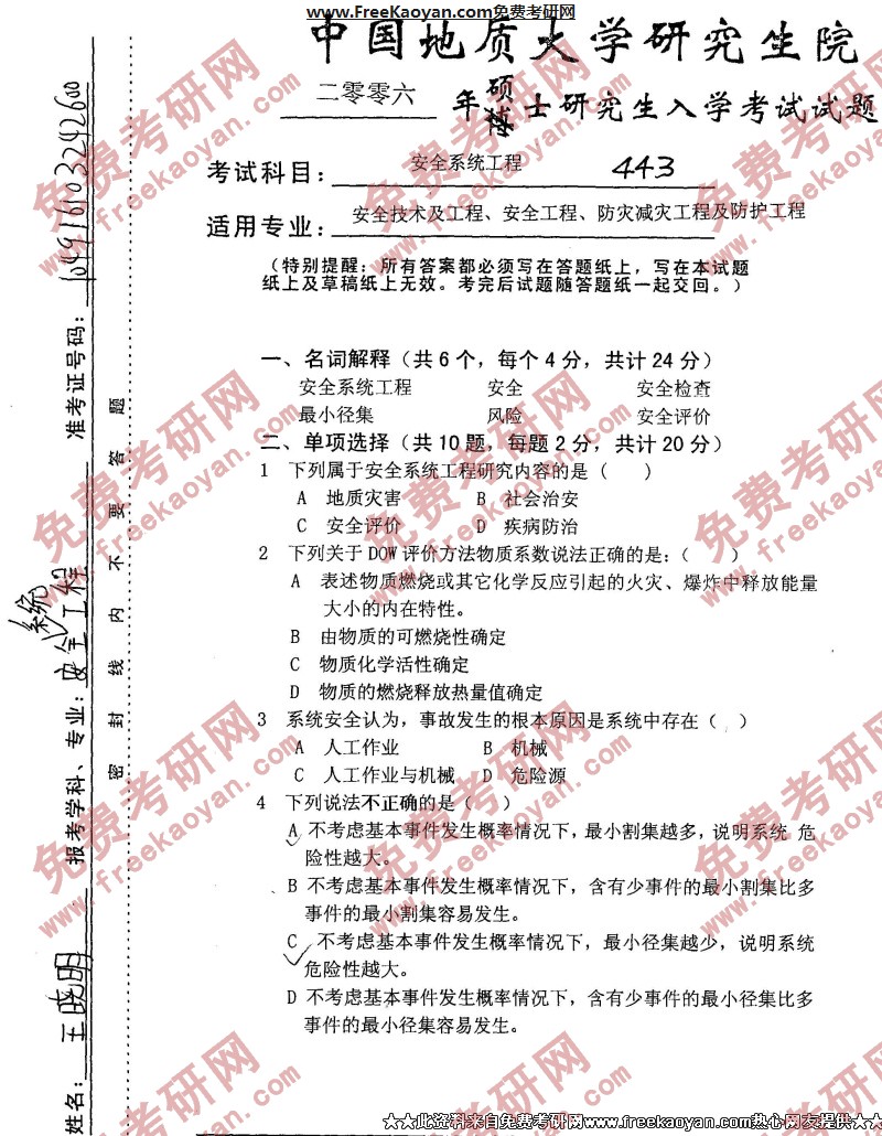 中国地质大学(武汉)2006年考研真题-安全系统工程