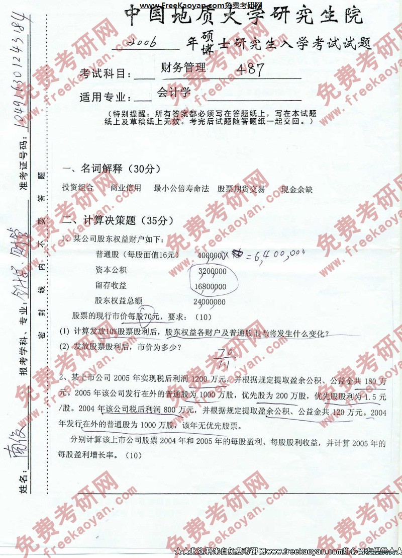 专业课考研经验 本站小编 FreeKaoyan 2018-01-23中国地质大学(武汉)2005年考研真题-中级财务会计