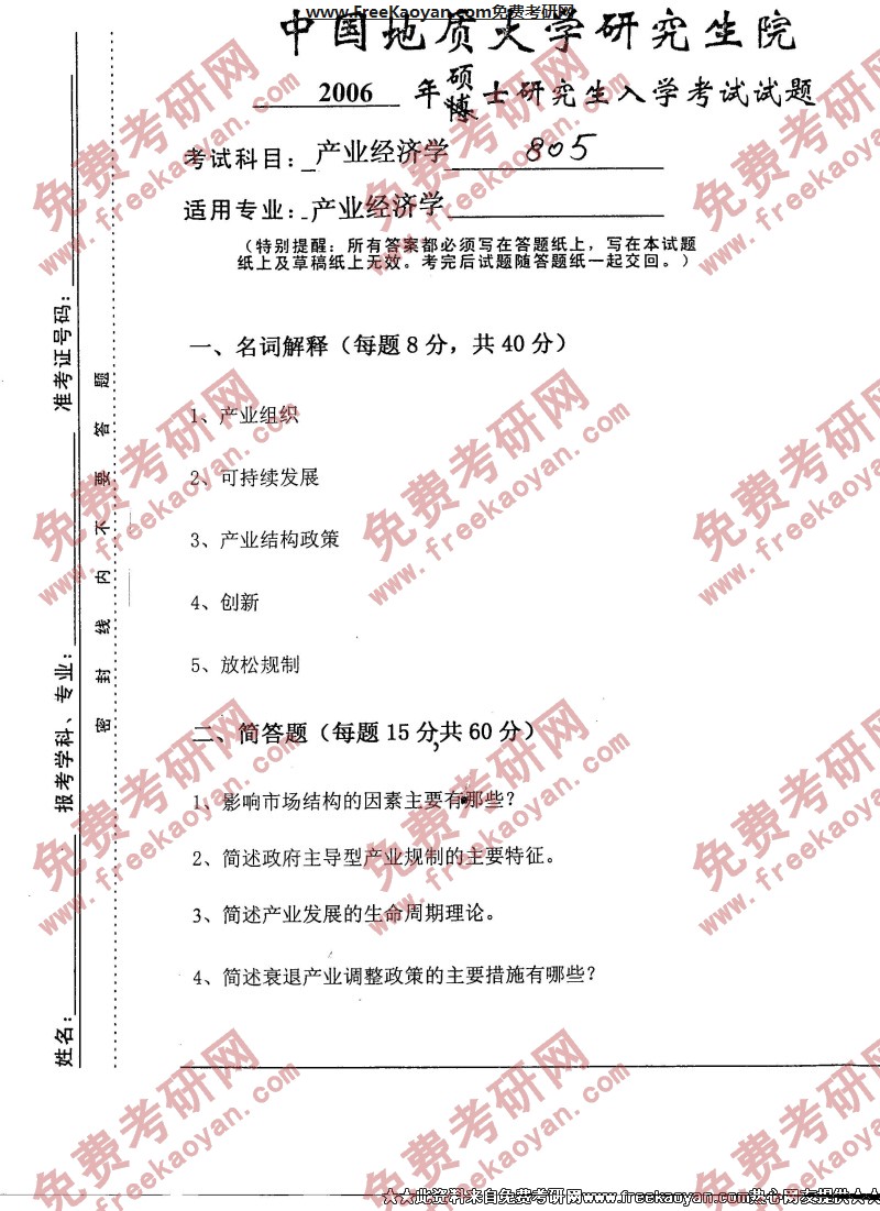 中国地质大学(武汉)2006年考研真题-产业经济学