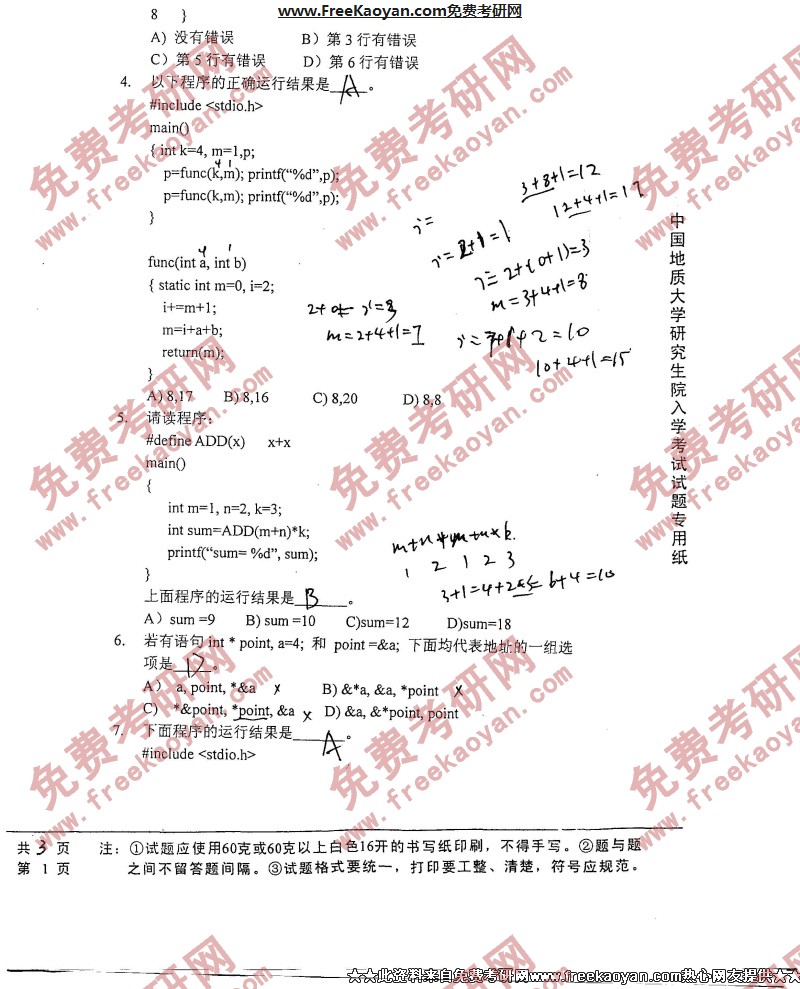 专业课考研经验 本站小编 FreeKaoyan 2018-01-23中国地质大学(武汉)2006年考研真题-C语言程序设计